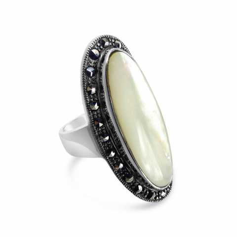 Marcasite Ring 11X28mm Oval Mother of Pearl Center Marcasite on Sid