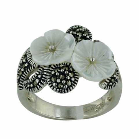 Marcasite Ring 2 White Mother of Pearl Flower with Marcasite Leaf
