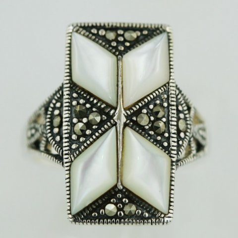 Marcasite Ring Cabochon White Mother of Pearl+Triangle Marcasite Rectangular