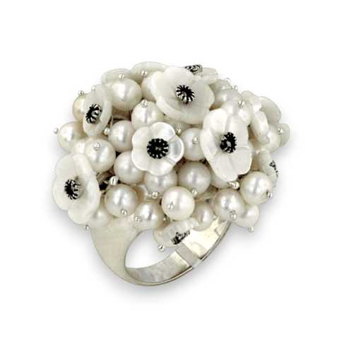 Marcasite Ring Cluster of Round Fresh Water Pearl and Flower Mother of Pearl