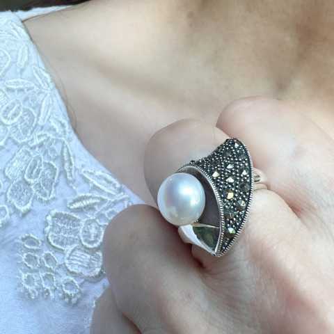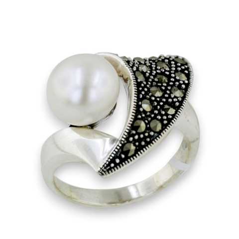 Marcasite Ring Half Open Heart Marcasite with 10mm Fresh Water Pearl